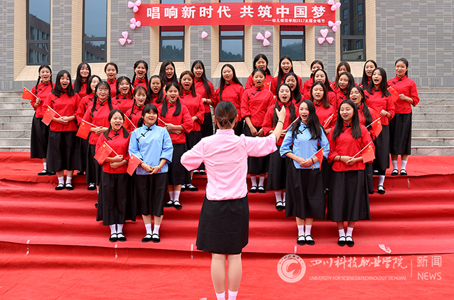 2017级18个班全体学生,饱含激情,先后登台演唱了《南泥湾》、《国家》、《红旗飘飘》、《映山红》、《歌唱祖国》、《保卫黄河》等18首歌曲。演唱中同学们抒发了浓浓的爱国情怀,情真意切。他们用优美的旋律和深情的演唱讴歌我们的新时代,表达了对党和祖国的热爱,对“十九大”提出的中华民族复兴的中国梦的无比向往。